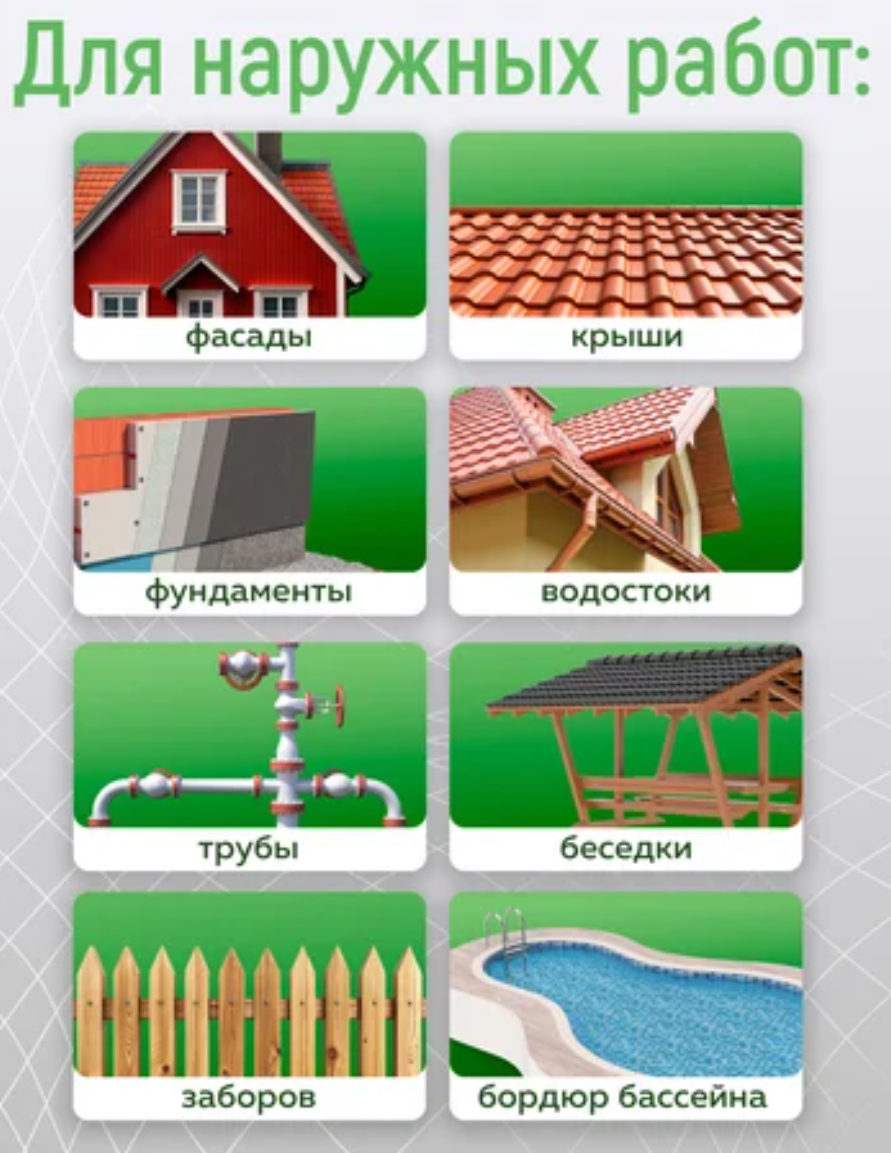 Высокая адгезия — прочное сцепление с большинством строительных материалов, включая бетон, металл, камень, дерево, шифер, рубероид, кирпич и даже некоторые пластики .