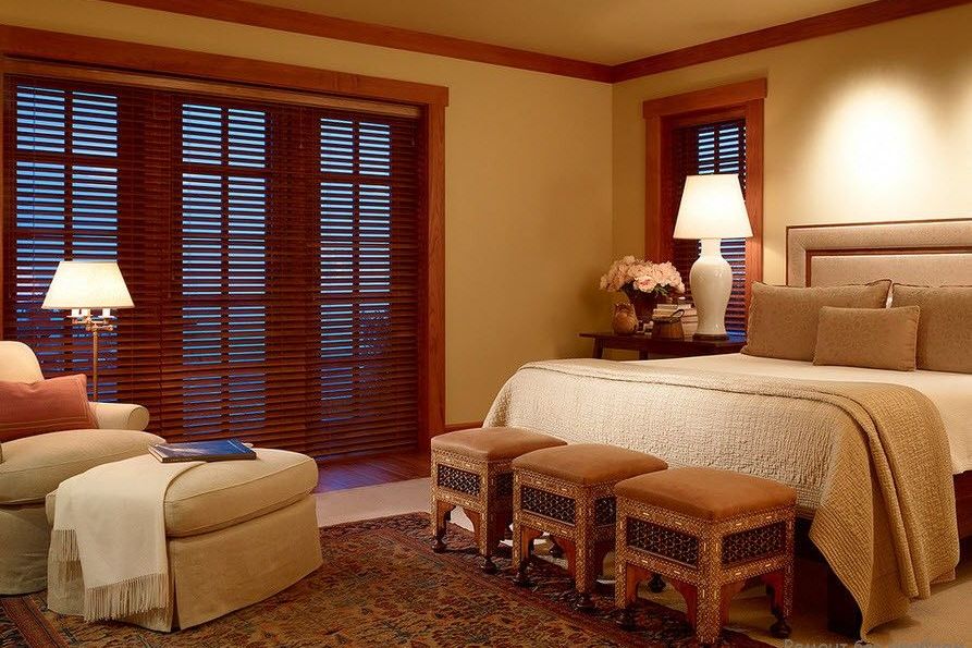 Деревянные жалюзи этого вида используются преимущественно в дизайне комнат в восточном, марокканском, этнографическом и кантри стилях. Они придают помещению особый шарм, хотя в интерьере маленьких комнат будут смотреться, так сказать, тяжеловато. Поэтому жалюзи вертикального типа лучше применяйте для оформления кабинета либо гостиной.