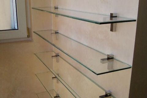 Самостоятельно крепление стеклянных полок к стене можно произвести как в ванной комнате, так и в спальне над туалетным столиком. Типы подобных полок и способы их крепления могут быть различными.