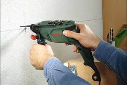 2. Просверлите при помощи электродрели отверстия для элементов крепежа (винтов, саморезов либо шурупов) в отмеченных местах. Глубину этих отверстий определите исходя из длины крепежных элементов. Чем больше нагрузка на стеклянную полку, тем длиннее должен быть элемент крепежа. Обычно длина шурупов – от 55 до 65 мм.