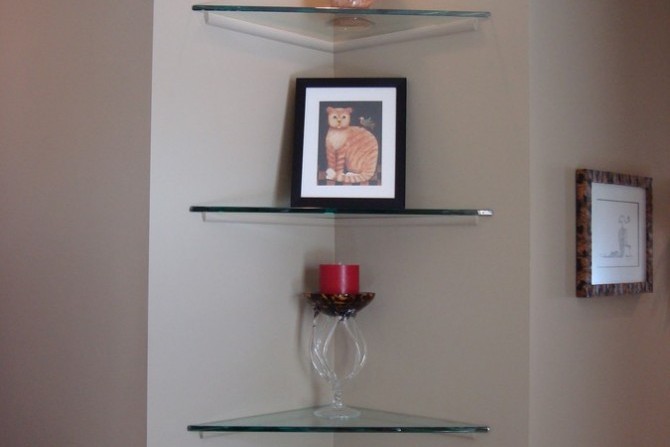 - Стеклянные угловые полки на стене