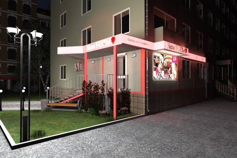 Им становится магазин, эскизный проект входной группы которого предусмотрел градацию светового потока – от чуть более яркого, чем уличное освещение, при входе, от замаскированных под козырьком ламп, до ярко-белого, рвущегося из торгового зала сквозь остекление входной группы.